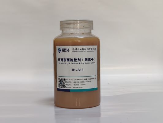 JINHAODA JH-611 Cationic Styrene Acrylic Surface Sizing Agent is a light brown liquid with superior properties for the treatment of paper surfaces. It is a cationic styrene acrylic surface sizing agent composed of Acrylates Copolymer, and is soluble in water. The agent provides excellent dispersion, water resistance and wet strength properties, and is stable at temperatures of 0-40℃.
